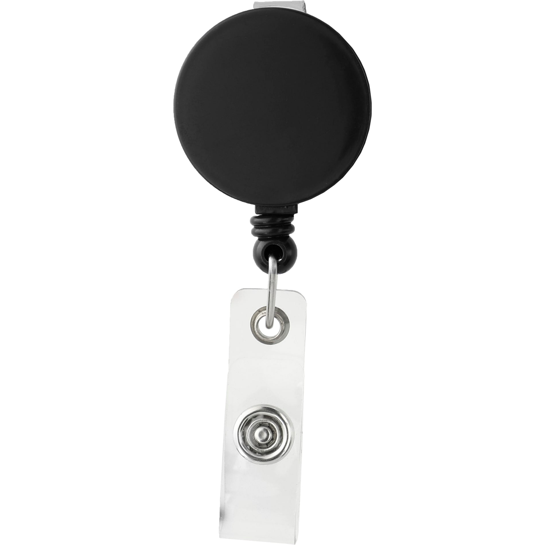 Retracting cord extends 32". Belt clip on back. Great for tradeshows and employee badges. Can also be used as a key ring holder.